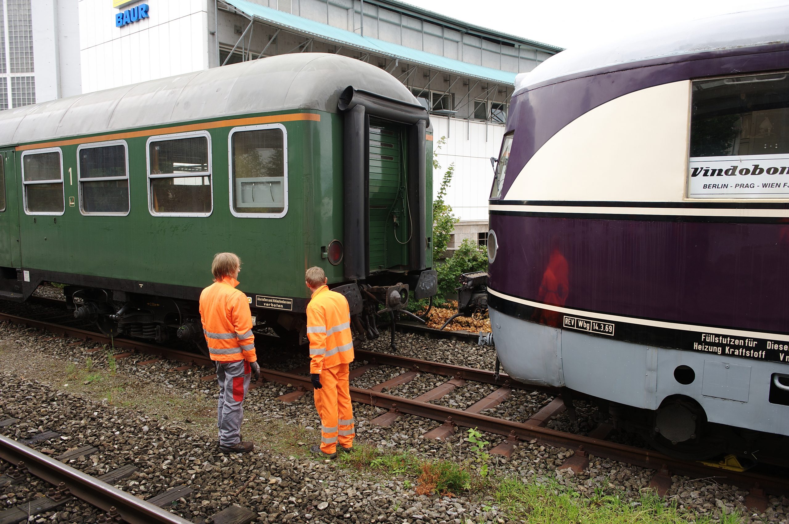 Vom 8. Juni 2011 bis zum 27. August 2011 besuchte der historische Schnelltriebwagen SVT 137 856 der Bauart KÖLN des Fördervereins Diesel-Schnelltriebwagen (SVT) e. V. Friedrichshafen. Während seines Besuches hatte er seinen Standplatz auf dem Gleis 4b des Hafenbahnhofs. So bot er allen Eisenbahnankömmlingen einen nicht alltäglichen Blickfang und erweckte Interesse. Auch von verschiedenen Positionen um den Hafenbahnhof und vom Zeppelin-Museum aus zog das große elegante Fahrzeug mit seiner attraktiven Farbgebung die Aufmerksamkeit auf sich. Ermöglicht hat diesen Besuch das Zeppelin-Museum Friedrichshafen mit seiner Einladung des Triebwagens zur Ausstellung „Wasser. Straße. Schiene. Luft: Mobilität am Bodensee“. Und am Bodensee in Friedrichshafen stand ja ein Teil der Wiege der Reichsbahn-Schnelltriebwagen: Im Windkanal des Zeppelin-Luftschiffbaus wurden die Untersuchungen zur Entwicklung optimaler Kopfformen für diese schnellen Fahrzeuge ausgeführt und bis auf die Ausnahme der Bauart BERLIN kamen die Dieselmotoren für die Schnelltriebwagen von der Firma Maybach. Die letzte vor dem Kriege konzipierte Schnelltriebwagenbauart MÜNCHEN sollte sogar komplett in Friedrichshafen von diesen beiden Firmen gefertigt werden. Vor diesem Hintergrund durfte also einiges Interesse am SVT 137 856 erwartet werden. Dass dann in der doch recht langen Präsentationszeit von zwei und einem halben Monat im Durchschnitt aber nahezu 100 Besucher je Tag – insgesamt waren es 7550 – den Triebwagen besichtigten, verblüffte. Aber die Verblüffung von Gast und Gastgeber wurde durch das pure Erstaunen der Besucher über die Existenz eines derartigen historischen Triebwagens und über die für seine Vorzeigbarkeit geleisteten immensen Außen- und Innenarbeiten weit übertroffen. Dass der Löwenanteil des Innenausbaus von arbeitslosen Jugendlichen geleistet wurde, erregte Bewunderung. Viele Jahre geführt von der Regionalinitiative Delitzsch fand nun eine große Leistung dieser jungen Menschen und ihres Leiters, Roland Oelschlegel, auch weit außerhalb ihrer Heimat mehr als verdiente Anerkennung. Und da hier gerade von Anerkennung die Rede ist: Den Triebwagen besuchten auch erstaunlich viele ausländische Gäste aus allen möglichen, auch überseeischen, Ländern. Was die den Triebwagen betreuenden Vereinsmitglieder dabei immer wieder bemerkten und nachdenklich machte, war die Hochachtung – anders mag man es gar nicht nennen – der ausländischen Gäste, oft hervorragend informiert, nicht nur für diese Leistung sondern insgesamt für unser Heimatland. Kritik einiger Puristen gab es natürlich auch. „Warum habt ihr nicht wieder den Originalfußbodenbelag von 1938 verlegt?“ war solch ein Kritikpunkt, der wohl an der Realität des Machbaren und seinen unausweichlichen Kompromissen vorbei geht.